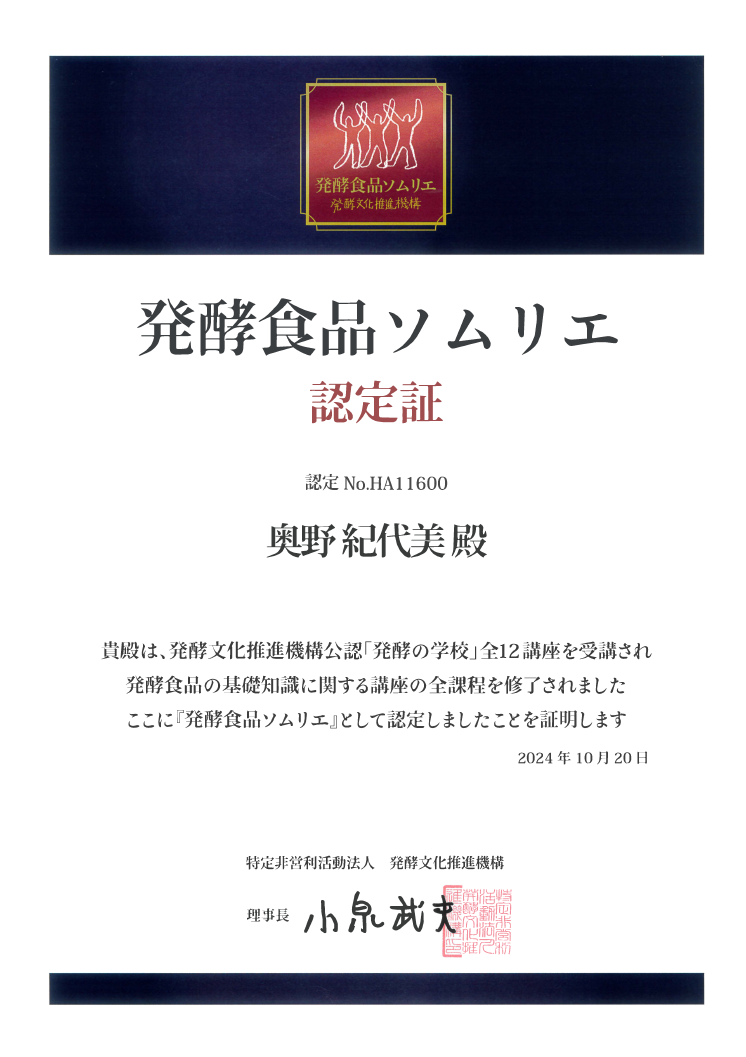 小泉武夫先生の「発酵の学校」全12講座カリキュラムを修了し発酵ソムリエの認定証取得、発酵文化推進機構との繋がりにより日本だけでなく世界の発酵食品にも目を向けていきお伝えしていきます。