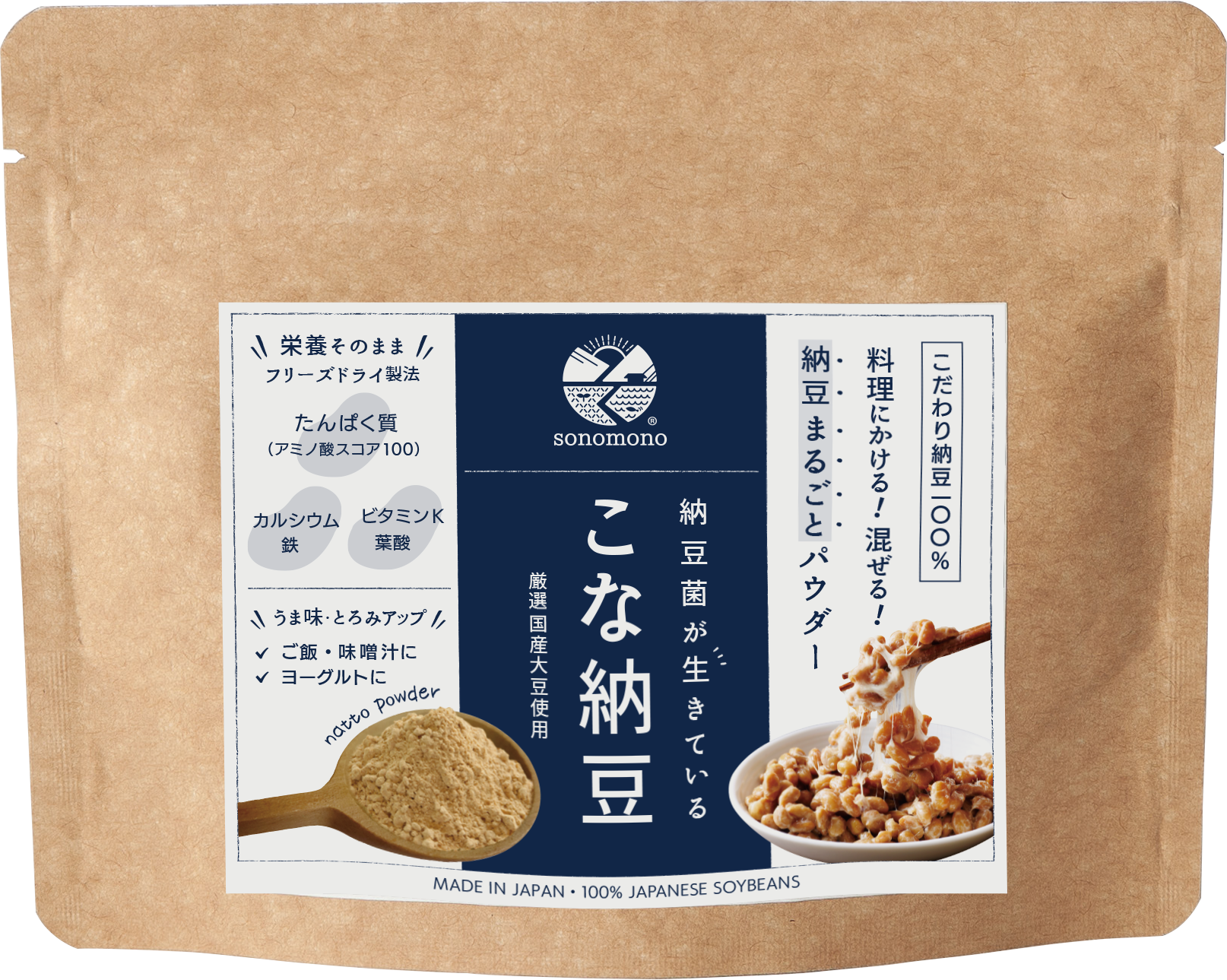 納豆が持つ有用成分を生かすためにフリーズドライ製法で粉末化したものです。納豆の栄養価はそのままに、生きたまま腸まで届く納豆菌も効率的に摂れ大変使いやすいです。