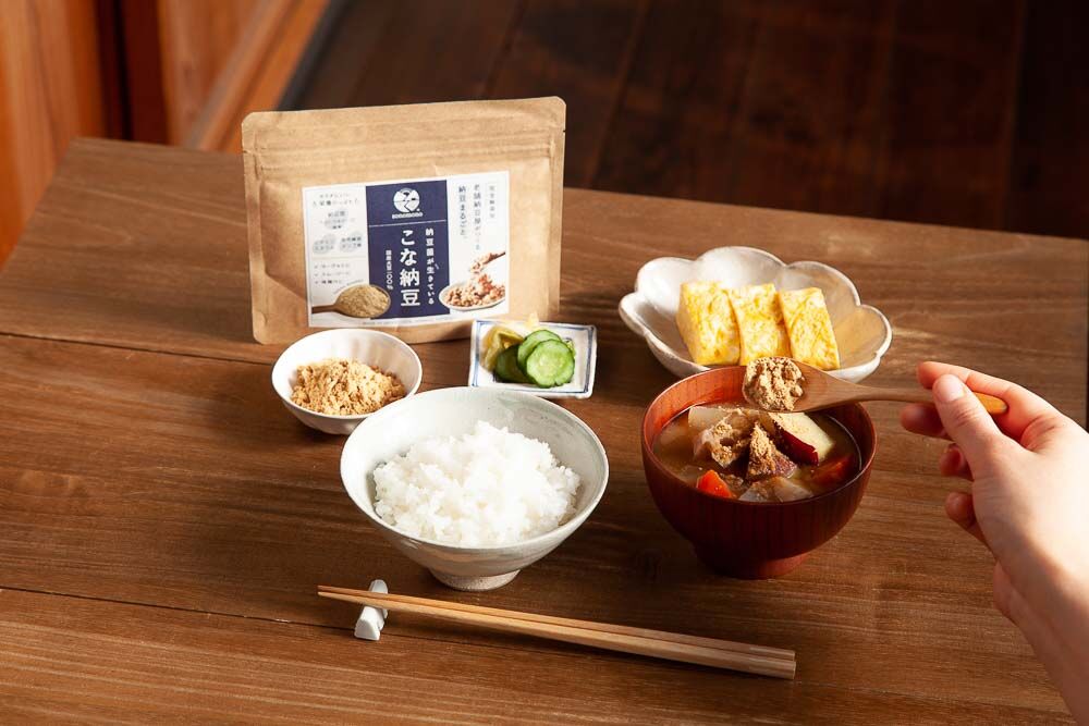 そして、栄養バランスと腸活を一杯の味噌汁で簡単に一度にとれ、食材の価値を余すことなく包み込んだ味噌玉を考えました。こな納豆の原料の大豆は、化学農薬・化学肥料不使用(栽培時)で、納豆菌については、熱にも胃酸にも強い芽胞状の納豆菌で、生きたまま腸まで届くというから、知れば知るほど素晴らしいものに出会ったと思いましたね。そこからは偶然が引き起こし、必然になっていったように思います。