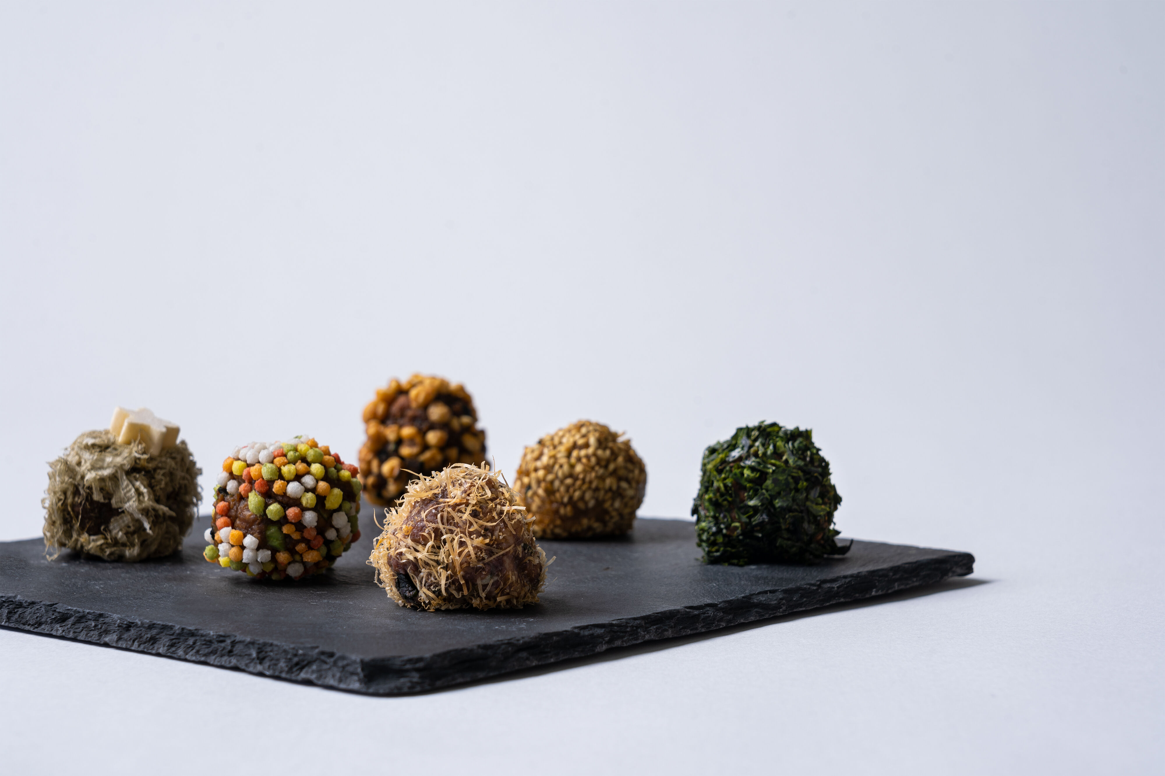 黄色いカップはひよこ豆味噌で白ごまをまぶしています。