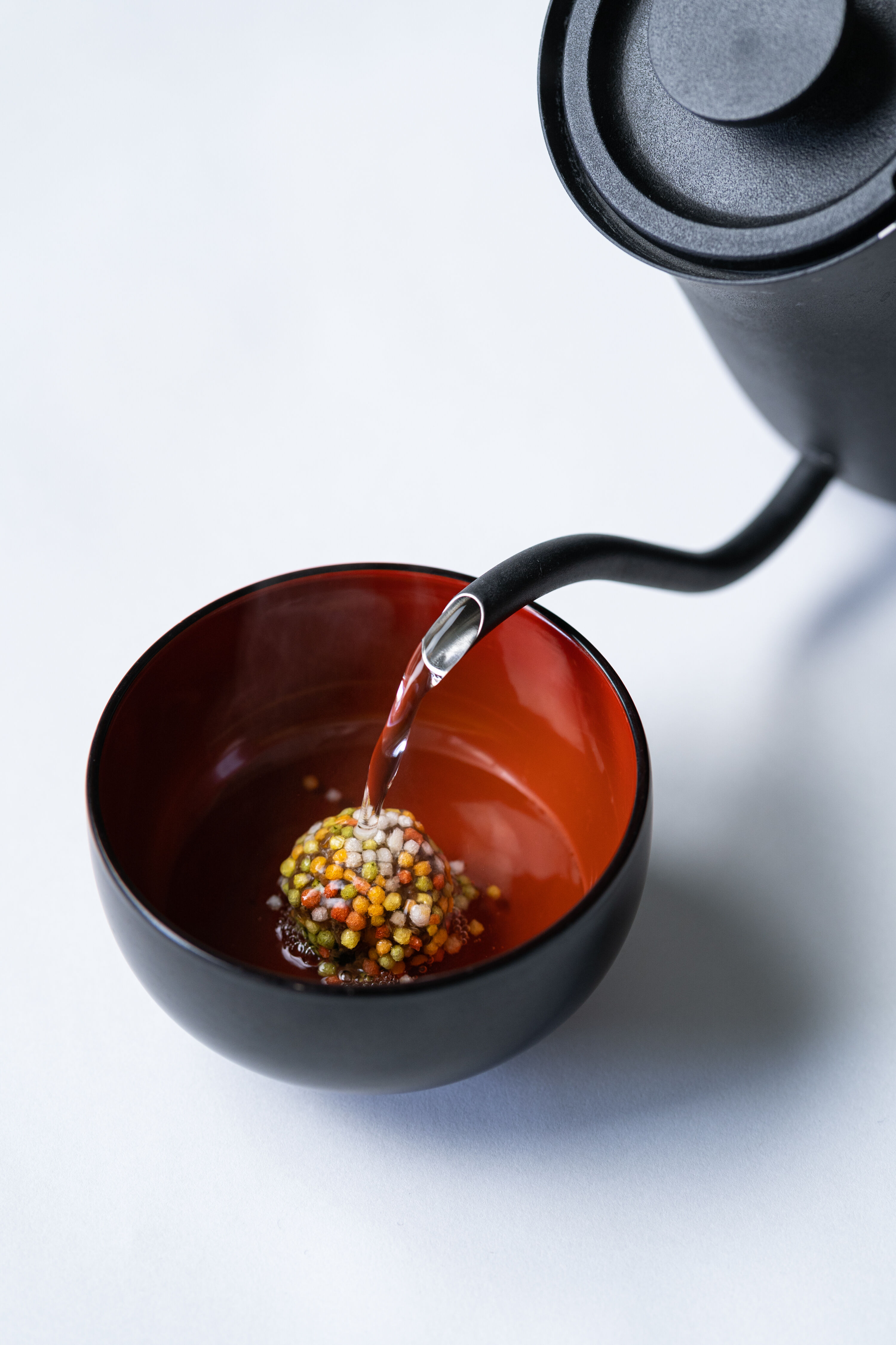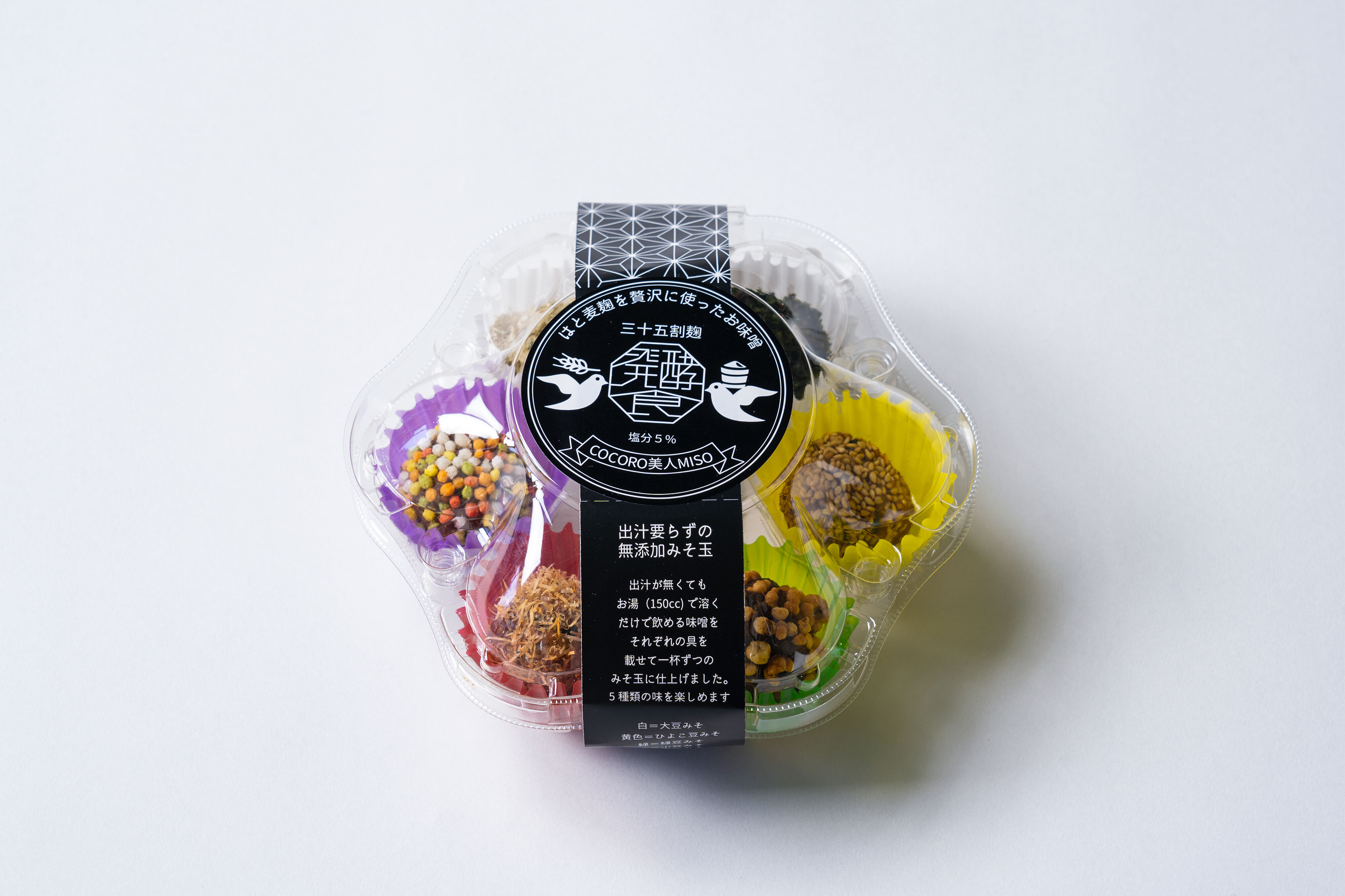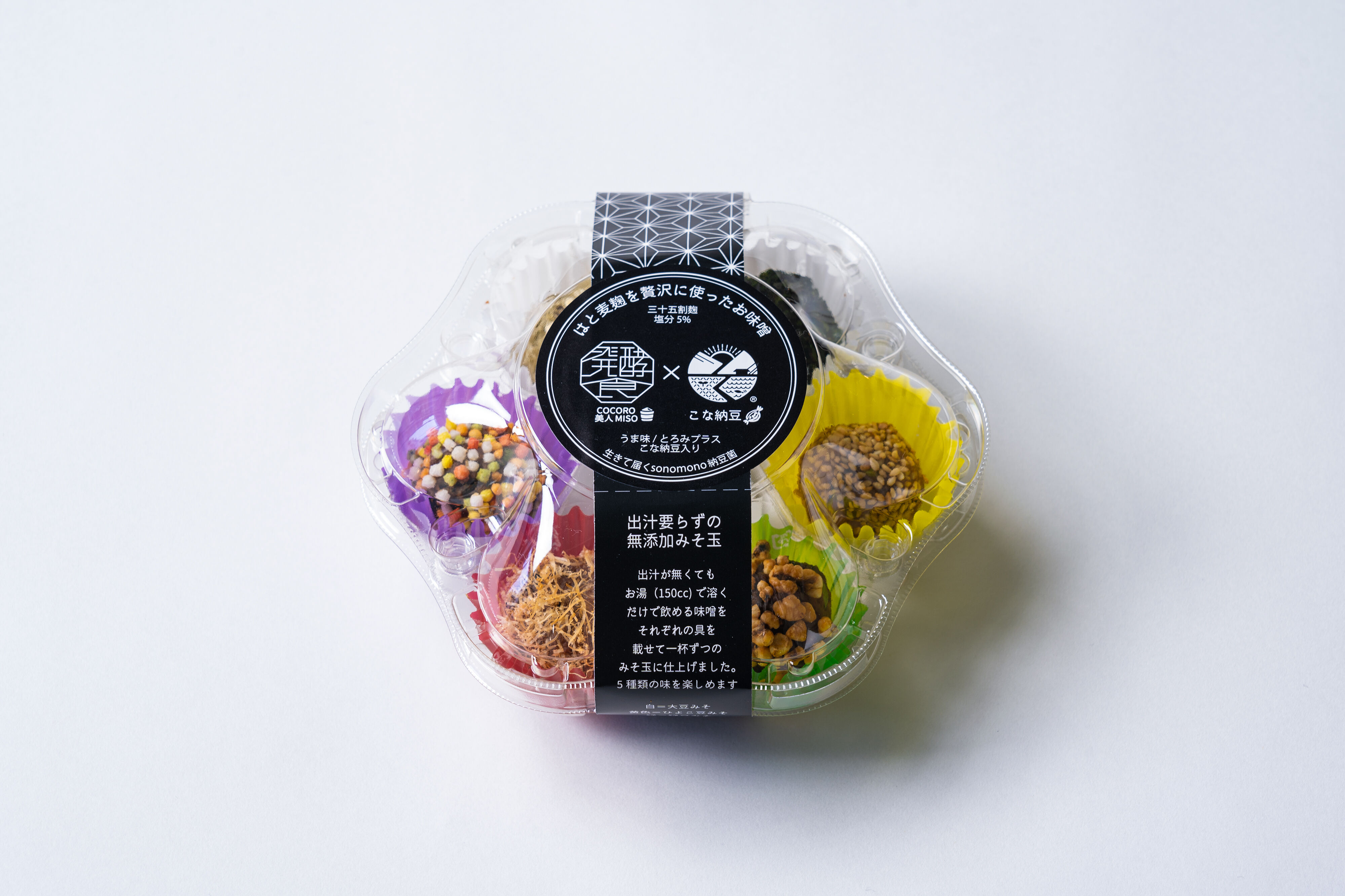 白のカップは大豆味噌で1個はとろろ昆布、1個はあおさをまぶしています。紫のカップは黒豆味噌で五色あられを、